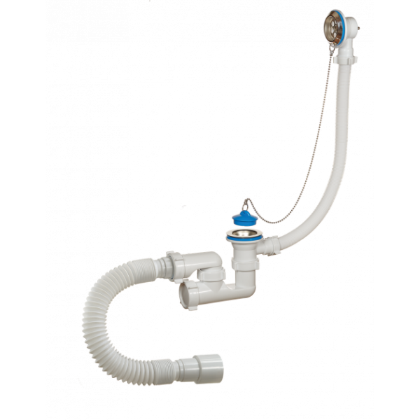Низький сифон для ванни з переливом і гнучким гофрованим виходом до каналізації. Матеріал корпусу — пластик та нержавіюча сталь, колір білий. Діаметр горловини 70 мм, підключення 1 1/2", вихід у каналізацію Ø40/50 мм. У комплекті пробка з ланцюжком.