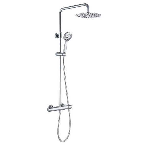Конструкція душової стійки включає вертикальний металевий профіль з інтегрованим термостатичним змішувачем, який забезпечує стабільну температуру води незалежно від коливань тиску. Цей виріб підходить для монтажу в домашніх ванних кімнатах та готелях, дозволяючи легко регулювати температуру і потік води, а також насолоджуватись душем із верхньою та ручною лійкою.