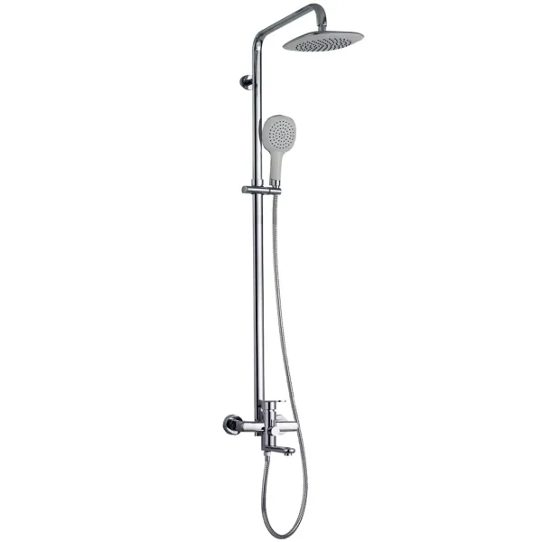 Корпус душової системи виготовлений із високоякісного металу з антикорозійним покриттям, що забезпечує довговічність та естетичний вигляд. Основні елементи системи: змішувач, душова штанга, верхній душ, ручна лійка та шланг. Покриття стійке до корозії, вологи та зношування, що дозволяє зберігати привабливий зовнішній вигляд навіть після тривалого використання.