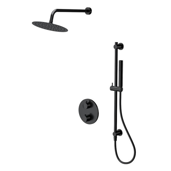 Комплект виконано у сучасному чорному кольорі, що додасть лаконічності та елегантності інтер’єру ванної кімнати. Прихований монтаж дозволяє інтегрувати пристрій без видимих труб і кріплень, зменшуючи візуальний безлад і полегшуючи процес прибирання. Термостатичний змішувач ефективно контролює температуру води, запобігаючи її несподіваним коливанням. Такий комплект підходить для сучасних ванних кімнат, як у житлових будинках, так і в комфортних готельних номерах або офісних санвузлах.