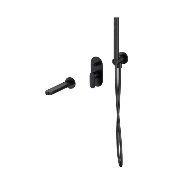 Комплект виготовлений у формі змішувача для ванни, який монтується приховано, що дозволяє зберегти чистоту та елегантність інтер’єру. Він оснащений водопровідним конектором, душовим комплектом і виливом для ванни. Продукт призначений для використання у житлових приміщеннях з сучасним дизайном та підходить для тих, хто цінує поєднання зручності і сучасного стилю. Матове чорне покриття вирізняє його серед інших сантехнічних рішень, забезпечуючи довготривалу стійкість до корозії та подряпин.