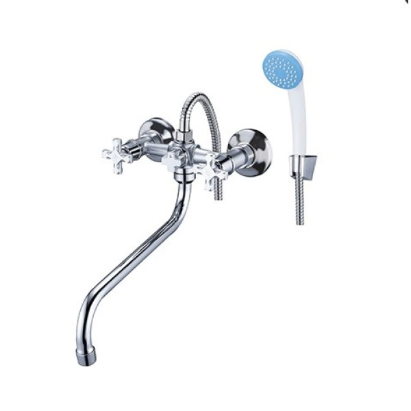 Корпус змішувача виготовлений з високоякісного металу із антикорозійним покриттям, що гарантує довговічність та естетичний вигляд. Основні елементи: корпус, носик та ручка для регулювання потоку та температури води і ручна лійка. Покриття запобігає корозії та зносу.