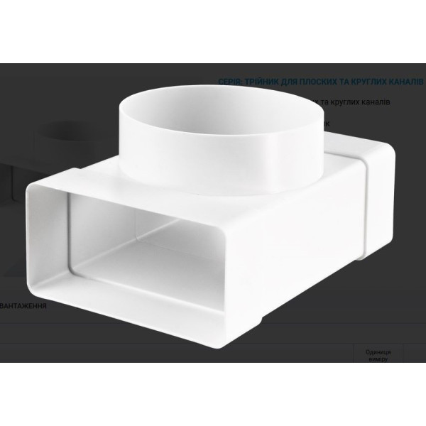 Даний трійник має конструкцію, що поєднує плоский і круглий перерізи, що робить його універсальним компонентом у системах вентиляції. Зазвичай використовується для з'єднання повітропроводів із різними типами профілю (плоским та круглим), що дозволяє гнучко організувати вентиляційні системи в різних приміщеннях. Підходить для монтажу в побутових та комерційних системах вентиляції.