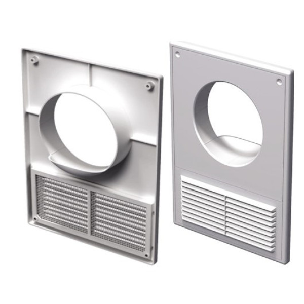Решітка виготовлена з високоякісного пластика, що гарантує її міцність і довговічність. Основними елементами конструкції є прямокутна панель із отворами для циркуляції повітря і кругле монтажне підключення діаметром 100 мм. Матеріал стійкий до вологи, ультрафіолету та температурних коливань, не піддається корозії. Поверхня виробу гладка, має захисне покриття, що мінімізує накопичення пилу.