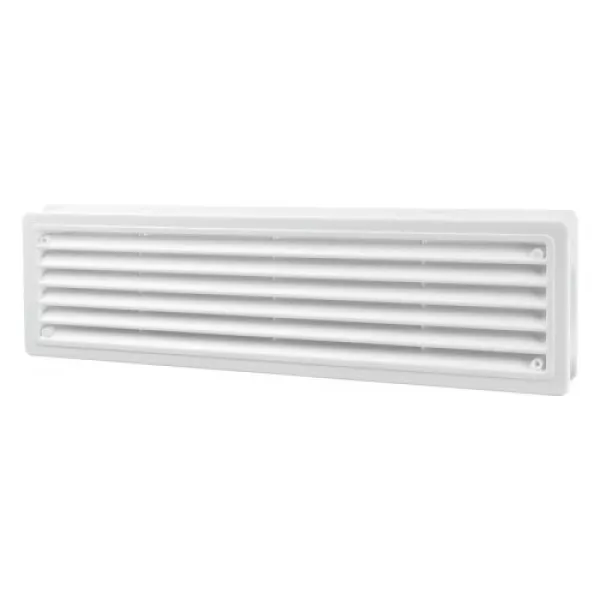 Решітка виготовлена з якісного пластика білого кольору з матовим покриттям, що забезпечує довговічність і стійкість до вигоряння. Вона має просту, але продуману конструкцію із суцільними ламелями, що сприяють ефективному проходженню повітря. Оптимально підібраний розмір і форма дозволяють гармонійно інтегруватись у двері різної товщини.