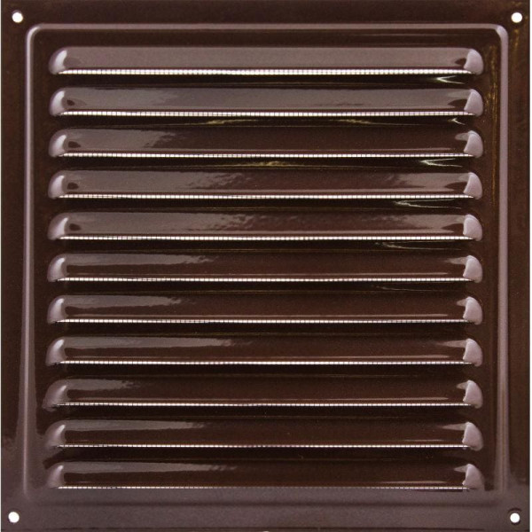 Ця вентиляційна решітка має класичну квадратну форму та виготовлена з міцного металу, пофарбованого у коричневий колір. Вона використовується для відведення або подачі повітря у системах вентиляції житлових і комерційних приміщень. Конструкція забезпечує надійний повітрообмін і стійкість до корозії завдяки якісному фарбуванню, що підвищує довговічність виробу. Решітка підходить для монтажу на вентиляційні канали відповідного розміру.