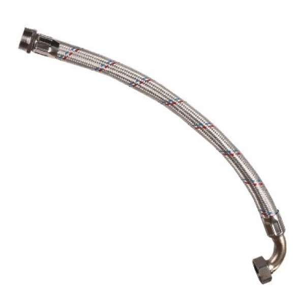 Внутрішня трубка (основа) виготовляється з товстостінної гуми EPDM (етилен-пропіленовий каучук). Вона нетоксична (харчовий допуск), витримує температуру до +90...+95°C і дуже еластична, що дозволяє їй розширюватися при тиску. Зовнішня оплітка - захисний шар з алюмінію. Вона не дає гумовій трубці роздутися або розірватися під тиском води (тримає до 10 бар). Фітинги (кінцевики): З одного боку накидна гайка з коліном і внутрішньою різьбою 1". З іншого — штуцер (зовнішня різьба) 1". Матеріал - нікельована або хромована латунь, стійка до корозії.