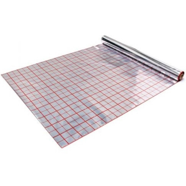 Фольга розкочується по підготовленій основі металізованою стороною догори перед укладанням труб. Стики між смугами рекомендується проклеювати монтажною стрічкою для суцільного покриття. Розмітка-сітка дозволяє одразу витримувати потрібний крок укладання труб без додаткового розмічення підлоги.