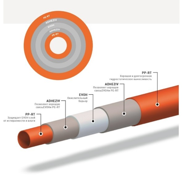 - Наявність кисневого бар’єрного шару EVOH для захисту сталевих частин системи від корозії.