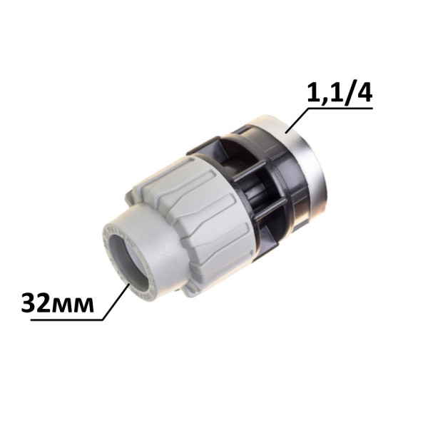 Ця муфта належить до фітингів, призначених для з'єднання труб. Вона ефективно забезпечує надійне з'єднання поліетиленових труб діаметром 32 мм з різьбовим з'єднанням 1 1/4 дюйма. Основними перевагами є простота монтажу, висока міцність та довговічність.