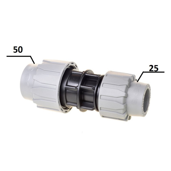 Корпус муфти виготовлений з високоякісного, міцного блок-кополімеру поліпропілену з етиленом , що забезпечує стійкість до агресивних середовищ і механічних впливів. Конструкція передбачає плавний перехід між трубами діаметром 50 і 25 мм, що гарантує надійну і герметичну фіксацію без використання додаткових ущільнювачів.