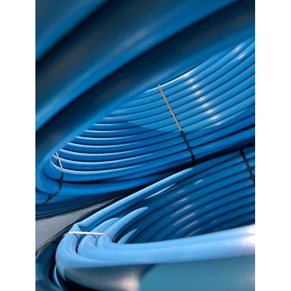 Труба виготовлена з високоякісного поліетилену, що відзначається підвищеною міцністю, гнучкістю та стійкістю до зовнішніх механічних пошкоджень. Поверхня труби рівна і гладка, що забезпечує низький коефіцієнт тертя та покращує пропускну здатність. Синє забарвлення слугує візуальним маркером для полегшення ідентифікації виду застосування трубопроводу.