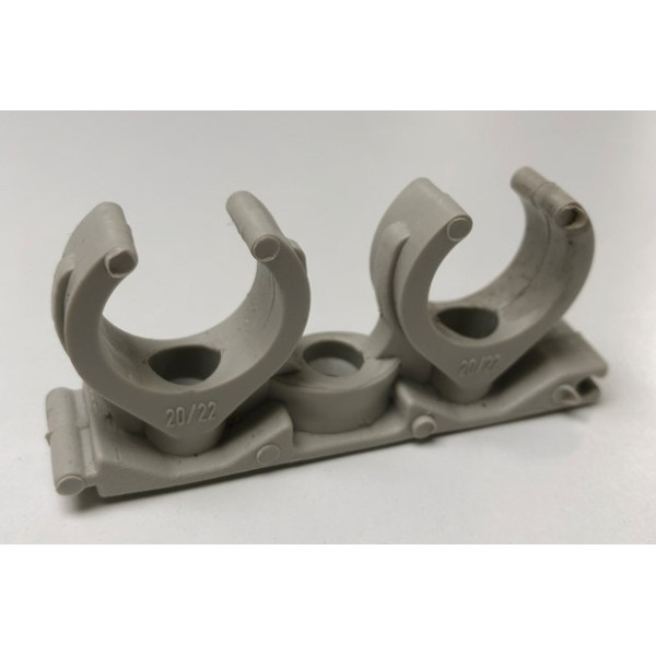 Подвійна кліпса виготовлена з високоякісного поліпропілену сірого кольору, який забезпечує довговічність та стійкість до механічних впливів і вологи. Вона призначена для кріплення двох труб одночасно, що робить її зручною для установки систем опалення, водопостачання чи інших трубчастих інженерних мереж. Кліпса надійно фіксує труби, не допускаючи їх зміщення та вібрації.