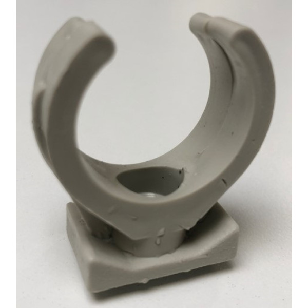 Кліпса виготовлена з міцного поліпропілену, що забезпечує стійкість до впливу вологи, ультрафіолету та хімічних речовин. Конструктивно вона має оптимальну форму для фіксації труби без її пошкодження, а також спеціальні ребра для надійного утримання. Матеріал є екологічно безпечним і довговічним.