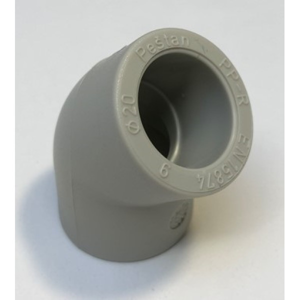 Кутник виготовлений із високоякісного поліпропілену за технологією, що забезпечує стійкість до агресивного середовища та температурних перепадів. Він має діаметр d20 та кут 45 градусів, що робить його ідеальним для з'єднання труб у трубопровідних системах. Зазвичай використовується в побутових чи комерційних системах водопостачання та опалення, відповідаючи стандартам надійності та довговічності.