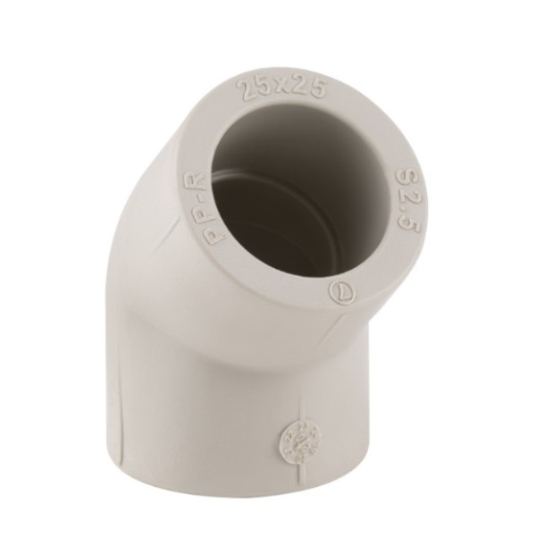 Кутник виконаний з міцного поліпропілену, що забезпечує стійкість до впливу корозії та хімічних речовин. Конструкція включає гладкі з'єднувальні торці для простого фіксування труб, що підтримує герметичність і довгий термін експлуатації.