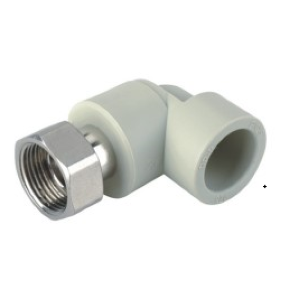 Кутник виготовлений з поліпропілену та міцного металу, який забезпечує надійність і довговічність експлуатації. Конструкція фітинга передбачає наявність накидної гайки, що полегшує з’єднання та демонтаж труб. Матеріал має антикорозійне покриття для запобігання іржі та корозії.