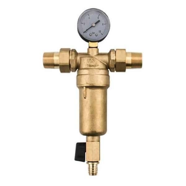 Корпус фільтра виконаний із міцної латуні, що забезпечує надійність та довговічність експлуатації у гарячому середовищі. Усередині знаходиться змінна сітка з нержавіючої сталі, яка затримує механічні домішки. Прозора колба дозволяє контролювати ступінь забруднення фільтра без розбирання конструкції. Нижній зливний клапан дає можливість швидко очищати фільтр від накопичених частинок.