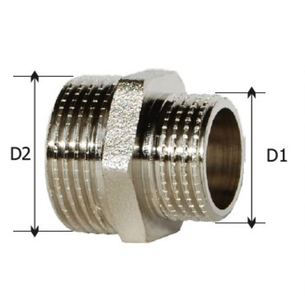 Ніпель KARRO виготовляється з латуні та має тип приєднання — зовнішня різьба / зовнішня різьба, що дозволяє зручно інтегрувати його в різні конфігурації трубопровідних систем. Модель є перехідною та забезпечує з’єднання різьбових елементів. Латунний корпус із нікельованим покриттям має сріблястий колір та відзначається високою міцністю і підвищеною стійкістю до корозії. Конструкція виробу гарантує герметичне та надійне різьбове з’єднання.