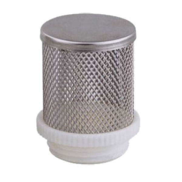 Сітка зворотного клапана встановлюється на різьбове приєднання зворотного клапана та використовується як фільтр грубого очищення. У зборі з клапаном вона занурюється у резервуар або джерело води, звідки здійснюється подача води до насосної системи. Основний фільтруючий елемент виготовлений із нержавіючої сталі, що забезпечує стійкість до корозії та тривалий термін експлуатації у водному середовищі. Корпус із полімерного матеріалу має різьбове підключення, що дозволяє легко встановлювати або замінювати елемент у разі потреби.