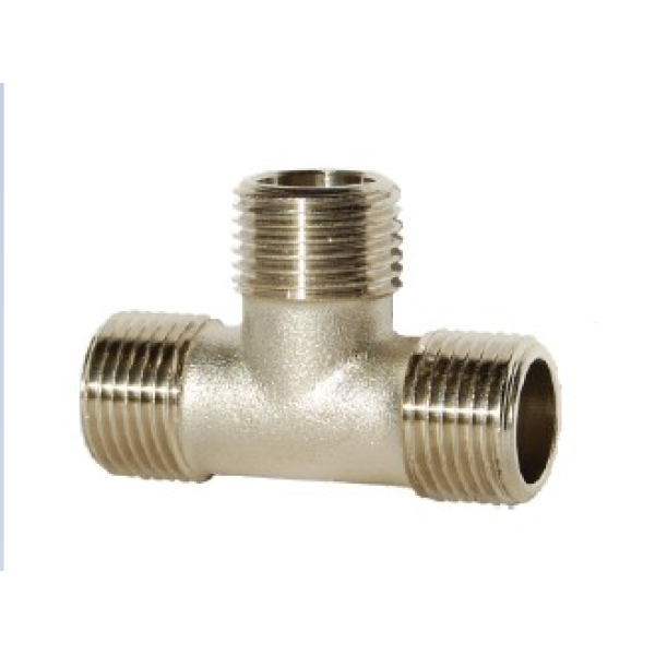 Фітинг виготовлений із міцного металу з нікельованим покриттям, що гарантує довгий термін служби без утворення корозії. Основними елементами конструкції є корпус із рівномірним різьбленням на трьох виходах, які забезпечують щільне й надійне з’єднання. Покриття нікелем підвищує стійкість до зношування та впливу агресивних середовищ.