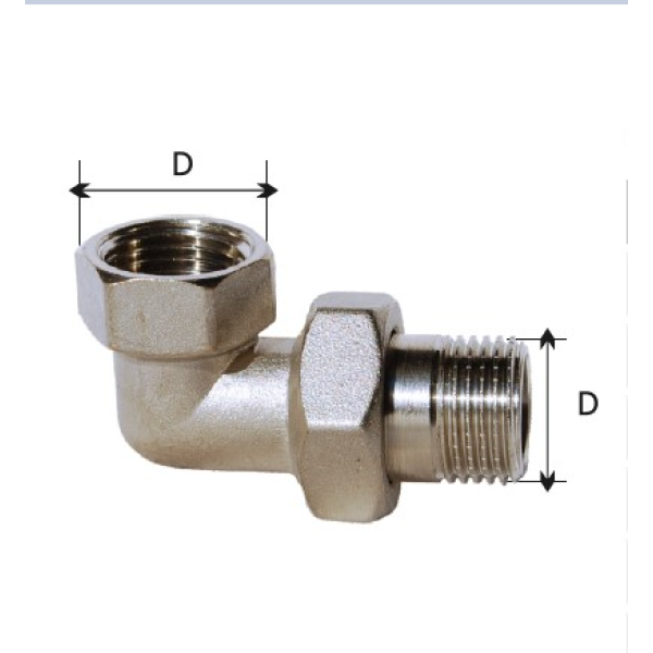 Згін‑американка кутова — це сантехнічний фітинг із накидною гайкою та комбінованою різьбою (зовнішня/внутрішня), призначений для герметичного, роз’ємного з’єднання трубопроводів під кутом. Виріб виготовлений із якісної латуні із нікелевим покриттям, що підвищує корозійностійкість та експлуатаційну довговічність.