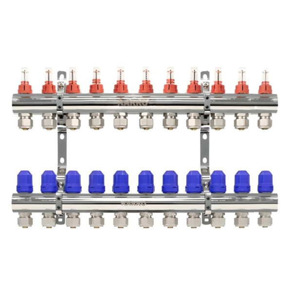 Ця колекторна група має 11 виходів і призначена для рівномірного розподілу теплоносія в багатогілкових системах. Вона ідеально підходить для приватних будинків, квартир чи невеликих комерційних об'єктів з радіаторним або підлоговим опаленням. Важливі особливості включають регулювання потоку на кожному виході, що дозволяє оптимізувати роботу системи та уникнути перегріву чи недостатнього нагріву.
