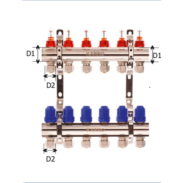 KARRO Колекторна група поєднує функціональність, надійність і простоту використання. Вбудовані витратоміри дозволяють зекономити час на налаштування й оптимізацію системи опалення, забезпечуючи точний контроль без додаткових витрат. Стандартні розміри фітингів гарантують сумісність з більшістю пристроїв на ринку, а латунна конструкція — довговічність роботи в умовах гарячого теплоносія. Обравши цю модель, ви отримуєте надійний й перевірений часом розв'язок для складних систем опалення та водопостачання.