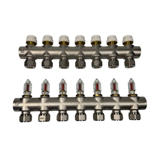 Колекторна група складається з подаючої та зворотної гребінки. Подаюча частина оснащена витратомірами для контролю витрати теплоносія, а зворотна — вентилями для регулювання або перекриття контурів. Латунний корпус із захисним покриттям гарантує довговічність та надійність.