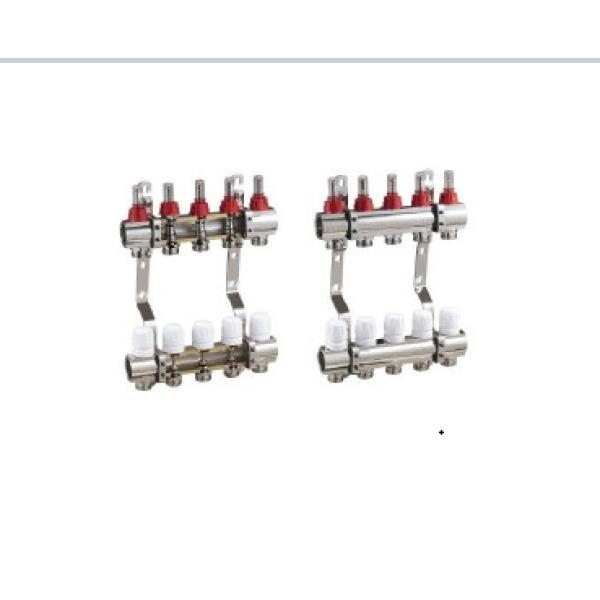 Колекторна група складається з подаючої та зворотної гребінки. Подаюча частина оснащена витратомірами для контролю витрати теплоносія, а зворотна — вентилями для регулювання або перекриття контурів. Латунний корпус із захисним покриттям гарантує довговічність та надійність.