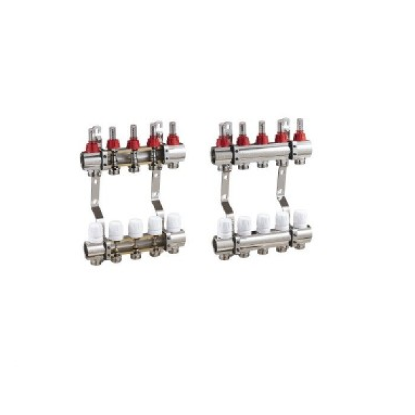 Колекторна група складається з подаючої та зворотної гребінки. Подаюча частина оснащена витратомірами для контролю витрати теплоносія, а зворотна — вентилями для регулювання або перекриття контурів. Латунний корпус із захисним покриттям гарантує довговічність та надійність.
