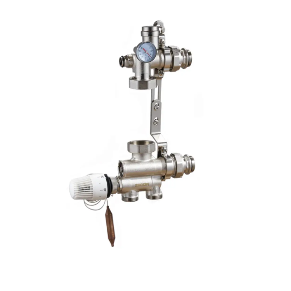 Корпус насосної групи виготовлений із латуні CW617N із нікелюванням, що забезпечує стійкість до корозії та механічних впливів у системах із гарячим теплоносієм. Регульована монтажна довжина насоса в діапазоні 130–180 мм дозволяє встановлювати стандартні циркуляційні насоси різних виробників без додаткових перехідників. Кутовий термоклапан із термоголовкою та занурювальним датчиком автоматично підтримує задану температуру в контурі. Конектори з вбудованими термометрами забезпечують візуальний контроль температури теплоносія на подачі та обратці безпосередньо на вузлі. Балансувальний клапан ручного регулювання дозволяє налаштувати витрату, автоматичний повітровідвідник захищає систему від завоздушування, а зливний кран спрощує обслуговування та демонтаж.