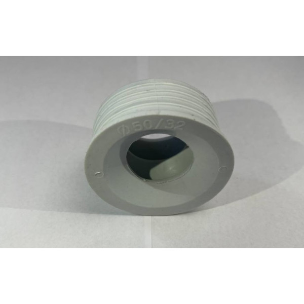 Редукція виготовлена з м’якого ущільнюючого матеріалу білого кольору, що забезпечує щільне прилягання до труб. Конструкція складається з двох різнорозмірних отворів, що дозволяє легко з’єднувати труби діаметрами 50 та 32 мм. Матеріал стійкий до деформацій, що забезпечує збереження герметичності навіть при тривалій експлуатації.