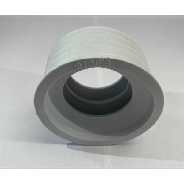 Дана редукція має циліндричну форму та використовується у водопровідних або опалювальних системах для з'єднання труб із зовнішнім діаметром 70 мм та 50 мм. Виготовлена з еластичного матеріалу білого кольору, вона забезпечує щільне прилягання та запобігає протіканням. Підходить для встановлення в житлових і комерційних приміщеннях, де потрібно зменшити діаметр трубопроводу.
